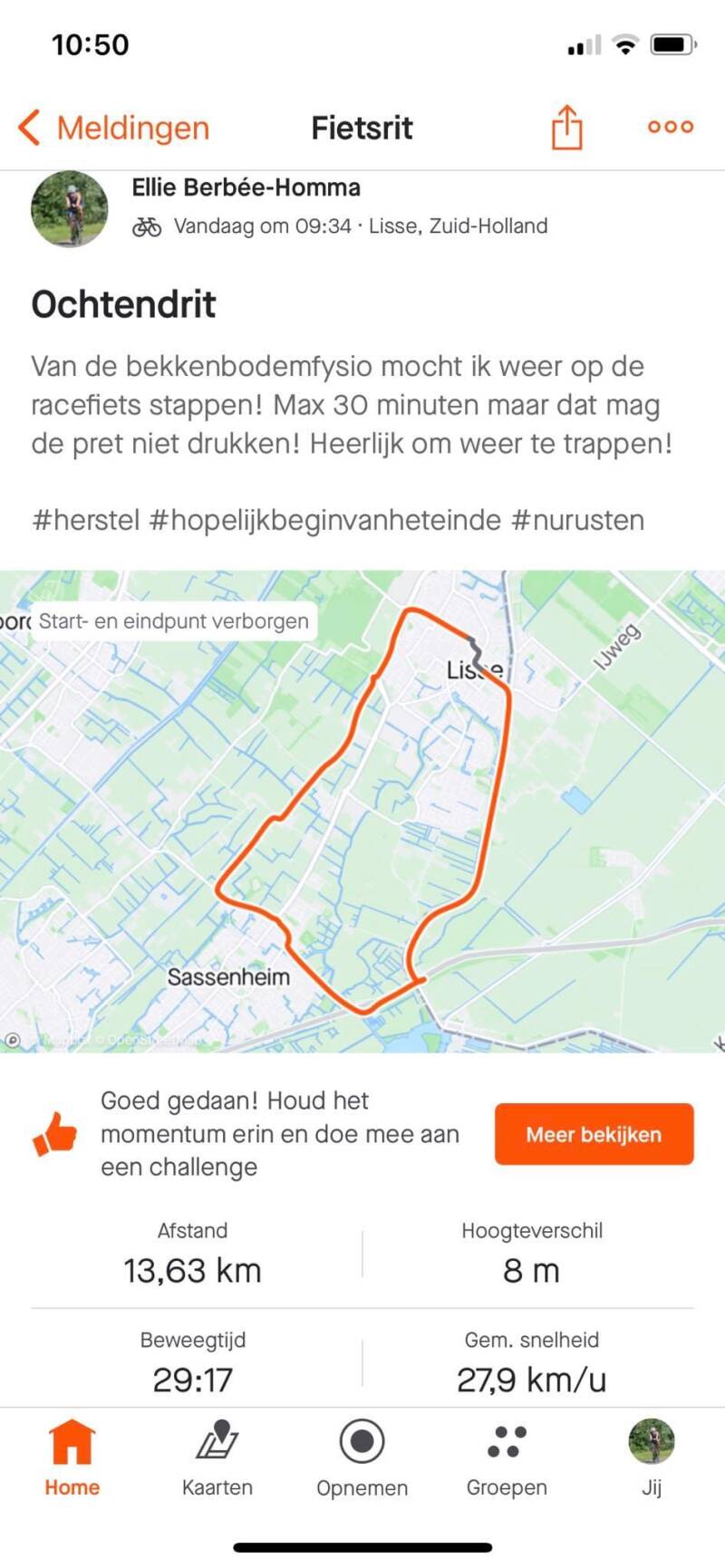 Ik merk dat ik echt beter kan focussen op de dingen waar ik voor sta. Ik ren niet meer aan alles voorbij maar neem echt de tijd voor dingen. En er is verbetering en daar houd ik me maar aan vast. Zo kan ik alweer met de kinderen spelen, hoef ik mijn zoontje niet meer aan z’n slaapzakje omhoog te hengelen en heb ik alweer een eerste ritje op de racefiets mogen maken.